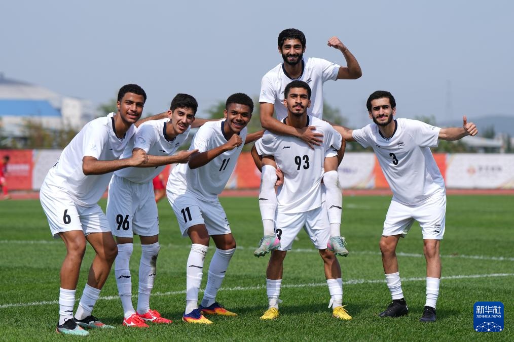 9月26日,沙迦大学队球员穆萨卜·易卜拉欣·卡拉姆·阿里(上)在比赛中点球破门后与队友庆祝。