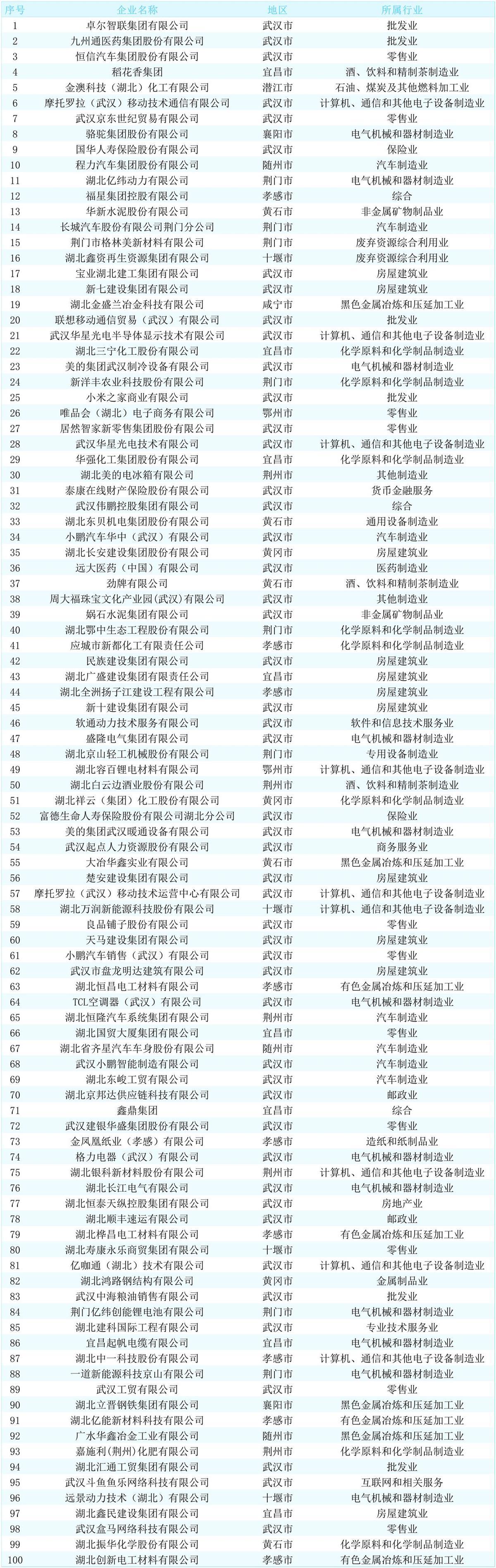 百强榜单排在前十位的企业是:卓尔智联集团有限公司、九州通医药集团股份有限公司、恒信汽车集团股份有限公司、稻花香集团、金澳科技(湖北)化工有限公司、摩托罗拉(武汉)移动技术通信有限公司、武汉京东世纪贸易有限公司、骆驼集团股份有限公司、国华人寿保险股份有限公司、程力汽车集团股份有限公司。