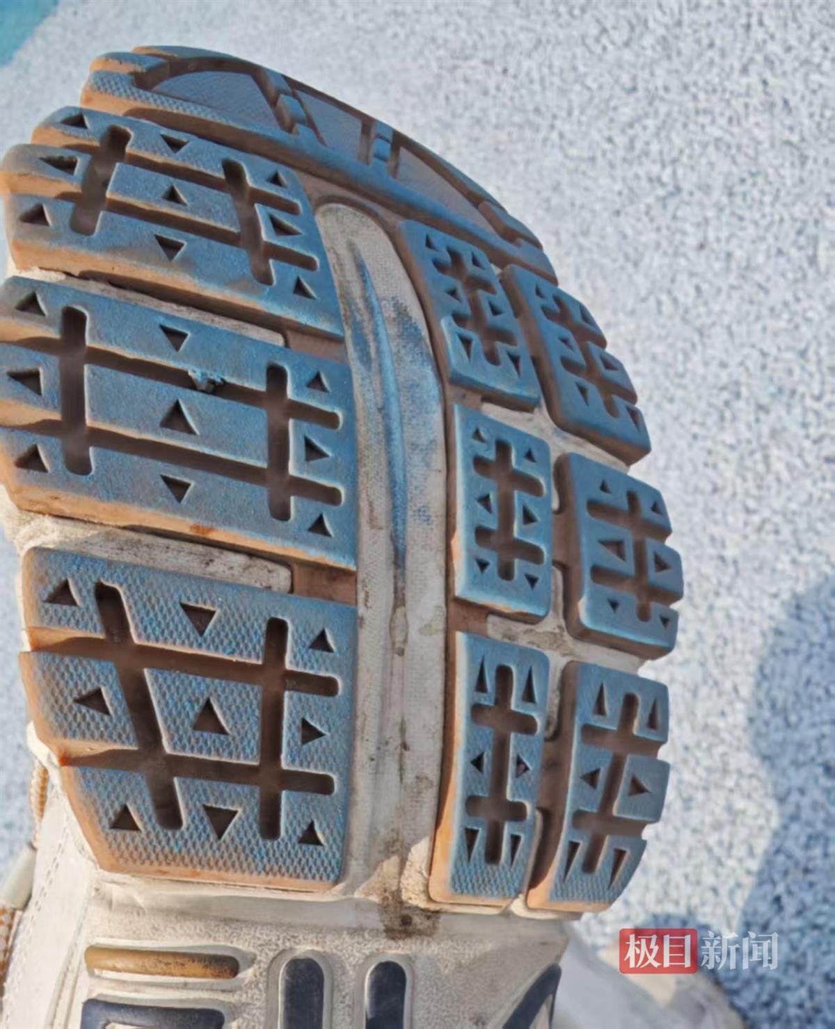 市民王先生称,在跑道上跑步后,他发现自己的鞋子被染蓝;另外,跑道味道刺鼻,夏天气温高时尤其明显,且跑道路面粗糙坚硬,跑感不佳,“感觉比柏油马路还要粗糙,表面有一些尖锐的碎渣,小孩跑完以后一旦摔倒被划伤怎么办?”