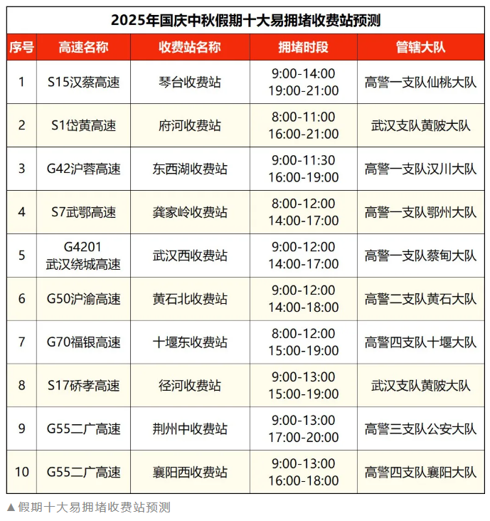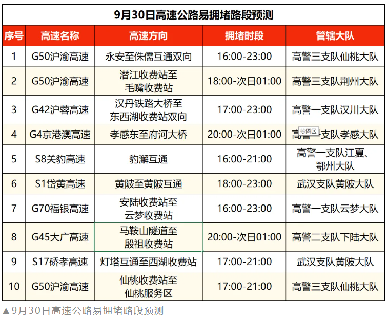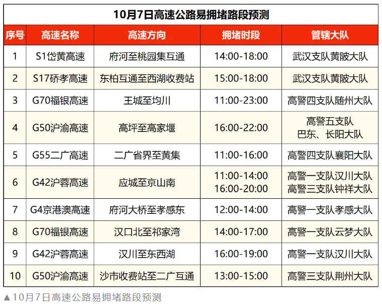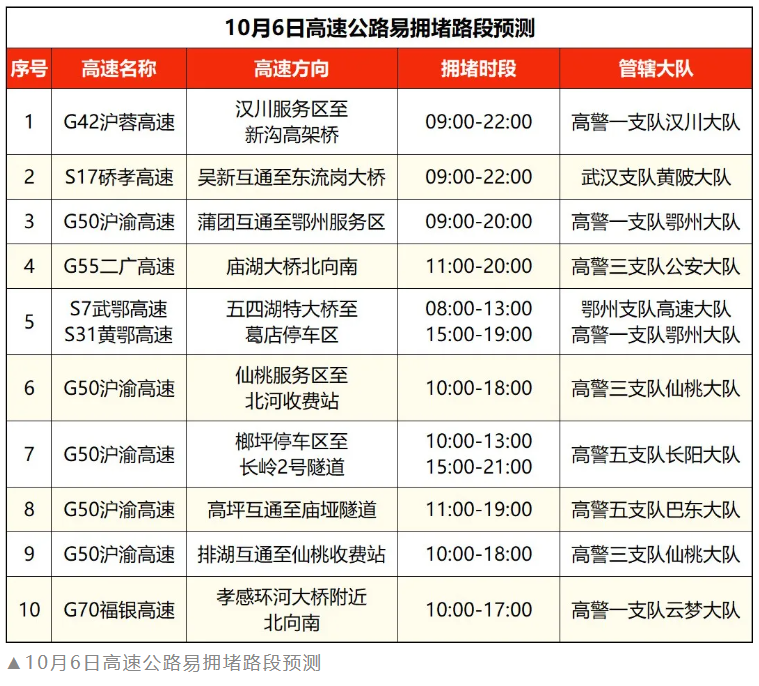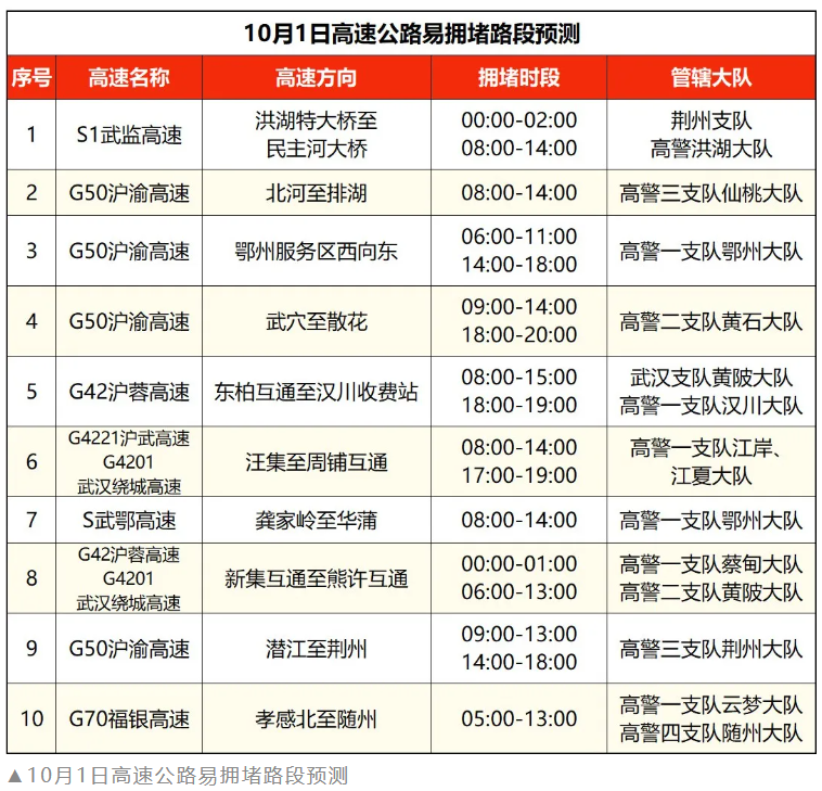 沪蓉高速汉川、当阳、钟祥、黄陂段,沪渝高速仙桃、荆州、长阳、黄石、巴东、鄂州、恩施段,福银高速云梦、随州、十堰段,京港澳高速孝感段,武鄂高速鄂州段,武汉绕城高速江夏、蔡甸段,武监高速武汉段,沪武高速江岸段,二广高速襄阳段,呼北高速十堰段等高速路段拥堵风险高。