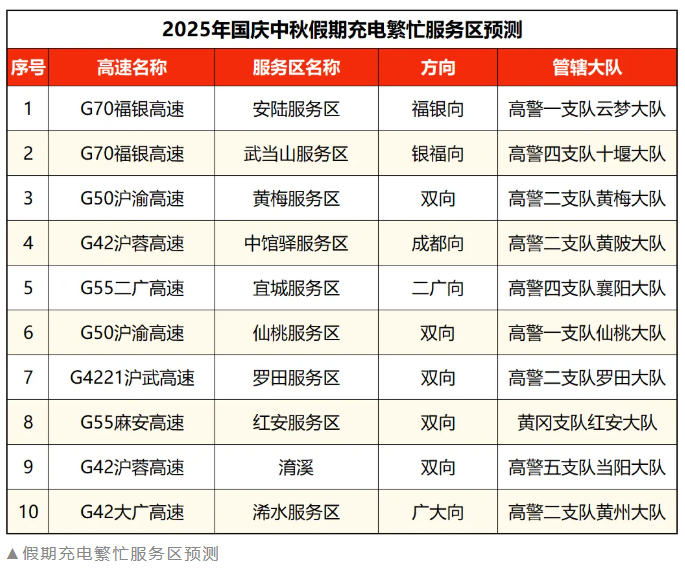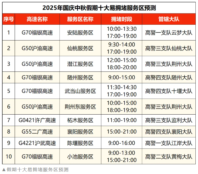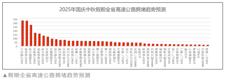 预计今年国庆中秋假期,仍呈集中出行分散返程特点,返程流量相对平稳,假期首日、第六日、第七日高速公路拥堵缓行风险突出。此外,加油、充电设施繁忙服务区车辆排队易倒灌主线引发事故,进一步加剧拥堵缓行风险。