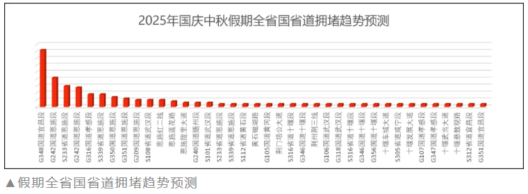 G348国道宜昌段,G242国道、G350国道、G209国道恩施段,G316国道孝感段;S233省道、S339省道恩施段,S108省道武汉段等国省道路段拥堵风险高。