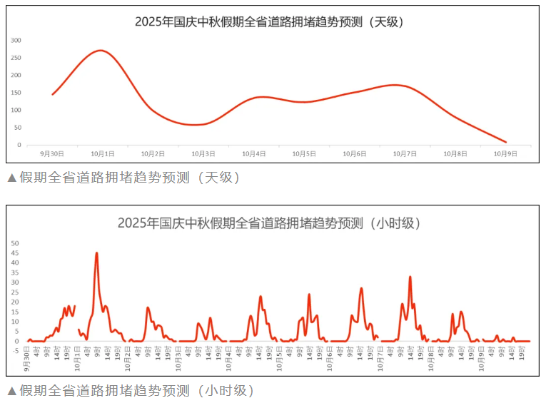 10月1日,出城车流量急剧上升,当日流量为全段假期峰值,上午9时至13时迎来最高峰。10月6日至7日,提前返程和错峰返程流量大,主要由周边县市向大中城市汇聚。10月8日,受错峰返程意识影响,路网流量较前阶段明显下降,返程高峰相对平稳。10月9日,路网流量逐步恢复常态。