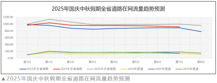 根据近年假期全省道路在网流量态势分析,预计今年道路日均在网流量将“井喷式”增长,较平日上升约7%~13%,达995~1010万台次;高速公路日均在网流量较平日上升约125%~130%,达150~156万台次。10月1日,全省流量达到峰值,约1140万台次左右,高速公路流量峰值或将突破200万台次。
