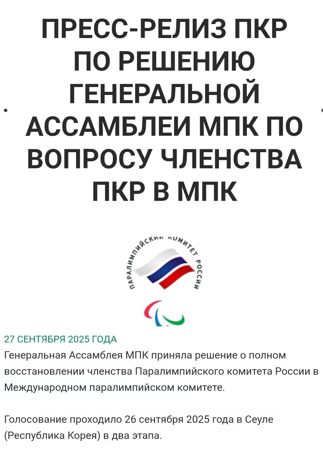 9月27日,在韩国首尔举行的国际残奥委会大会经投票决定,全面恢复俄罗斯、白俄罗斯残奥委会的会员资格与权利。国际残奥委会在官网发布声明称:“将与上述两个会员组织保持密切合作,尽快采取切实可行的后续措施。”