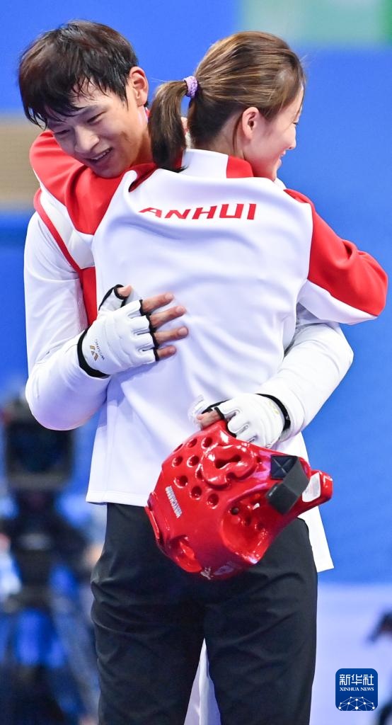 9月27日,安徽队选手刁李星君(左)和教练在比赛后拥抱庆祝。