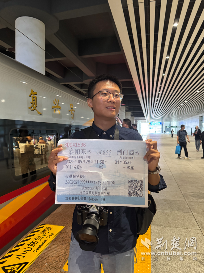 “心情非常激动,我要去荆门东宝找朋友聚餐!”武汉小伙小马手拿一张打印的巨型车票,在列车前拍照。