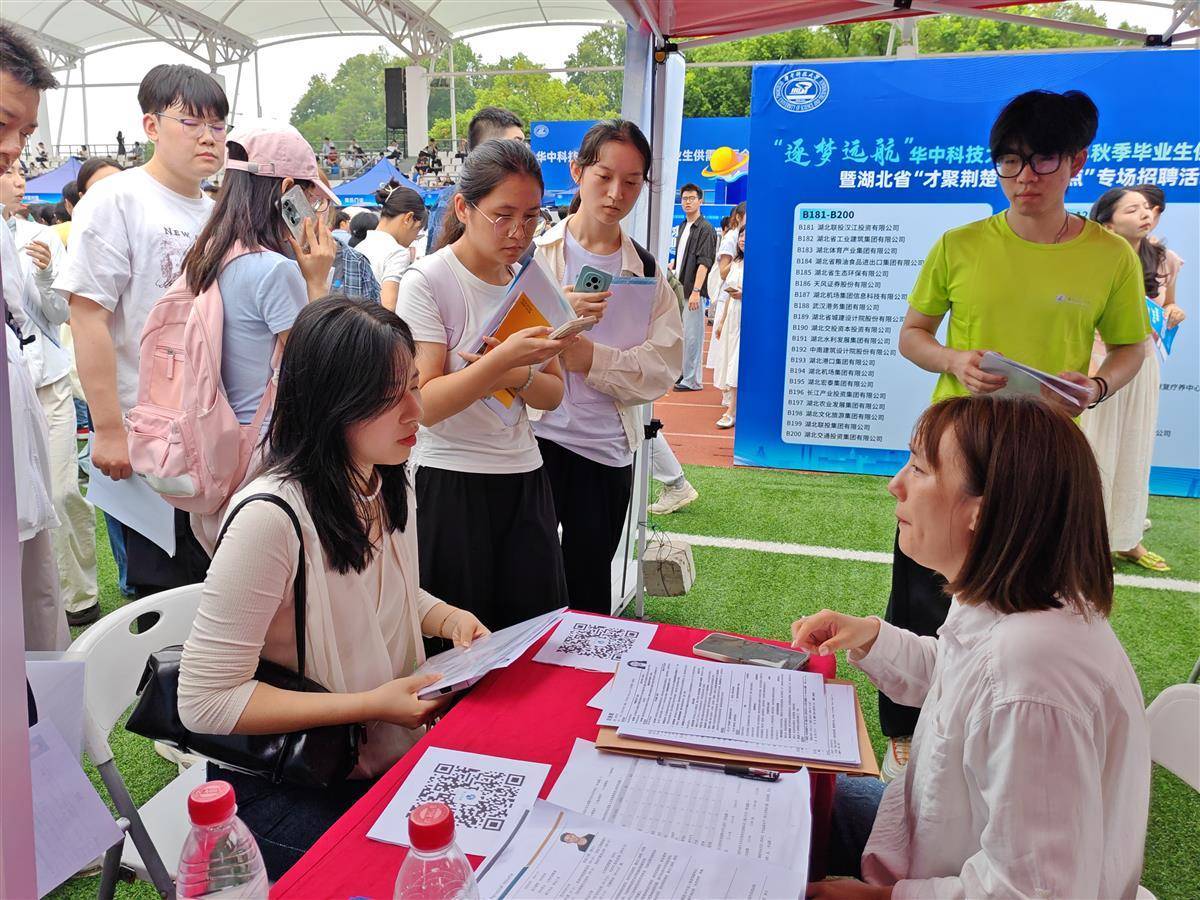 湖北日报讯(记者左晨、通讯员郭之、实习生刘诗懿)9月28日,华中科技大学校内操场热闹非凡,手拿简历的学生们在各企业展位间穿梭,有的仔细查看岗位信息,有的与企业工作人员积极洽谈、踊跃自荐。这里正在举行的,是由湖北省政府国资委联合省人力资源和社会保障厅、华中科技大学主办的“才聚荆楚·共建支点”2025年湖北“国企优聘”秋季高校招聘会。