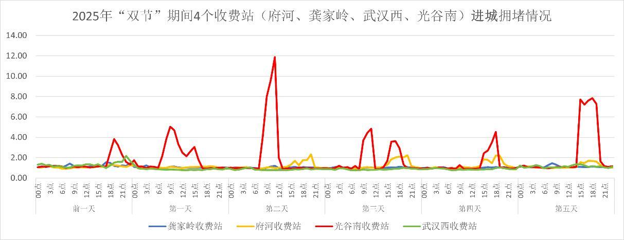 进城方向交通压力较大的为光谷南收费站,预计放假前一天的18时至21时、假期首日的8时至15时、假期后三天的11时至19时,车流量密集。