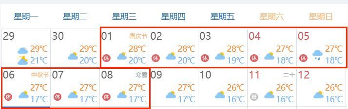 根据气象部门信息,双节期间我市整体以多云为主,其中10月5日可能有降雨,气温保持在17至28℃,天气较为凉爽,适合出行游玩。