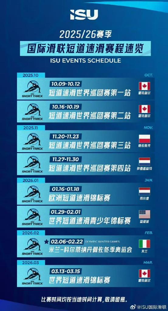 本赛季世巡赛共有四站,前两站举办地都是加拿大蒙特利尔,其中首站将于10月9日开启,第三和第四站将于11月在波兰格但斯克、荷兰多德雷赫特先后举行;随后便是2026年2月的米兰冬奥会;短道速滑世锦赛将于3月在蒙特利尔上演,为赛季收尾。