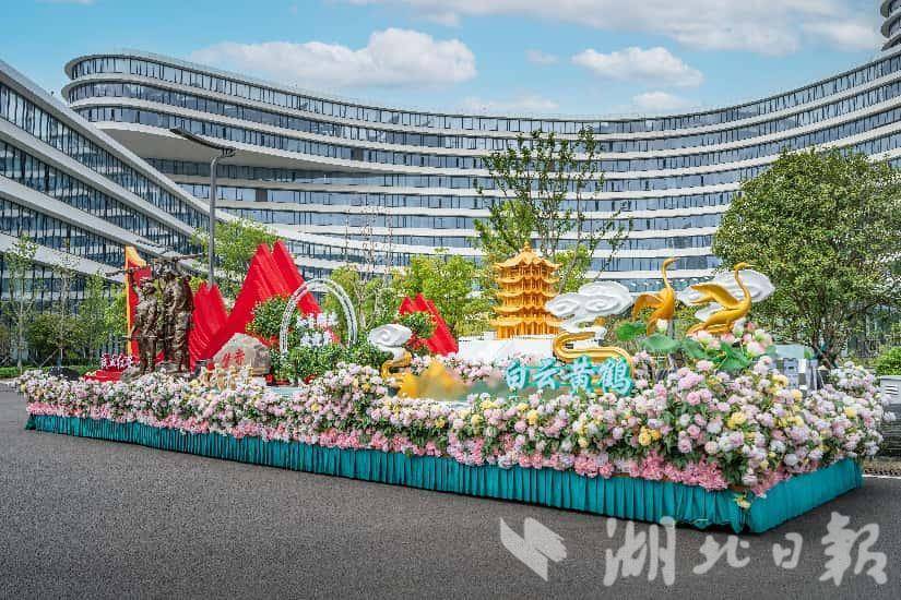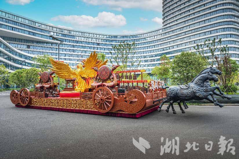 楚风汉韵花车上,一只振翅腾飞的金凤傲立黄鹤楼前,尽显“凤舞九天”的磅礴气势。