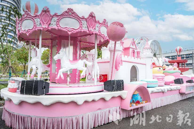 粉色城堡、旋转木马、摩天轮与热气球同框,“动漫萌宠”花车主打童心满满,长江江豚“豚宝”环绕车身,诉说江城武汉与长江生态相融的故事。