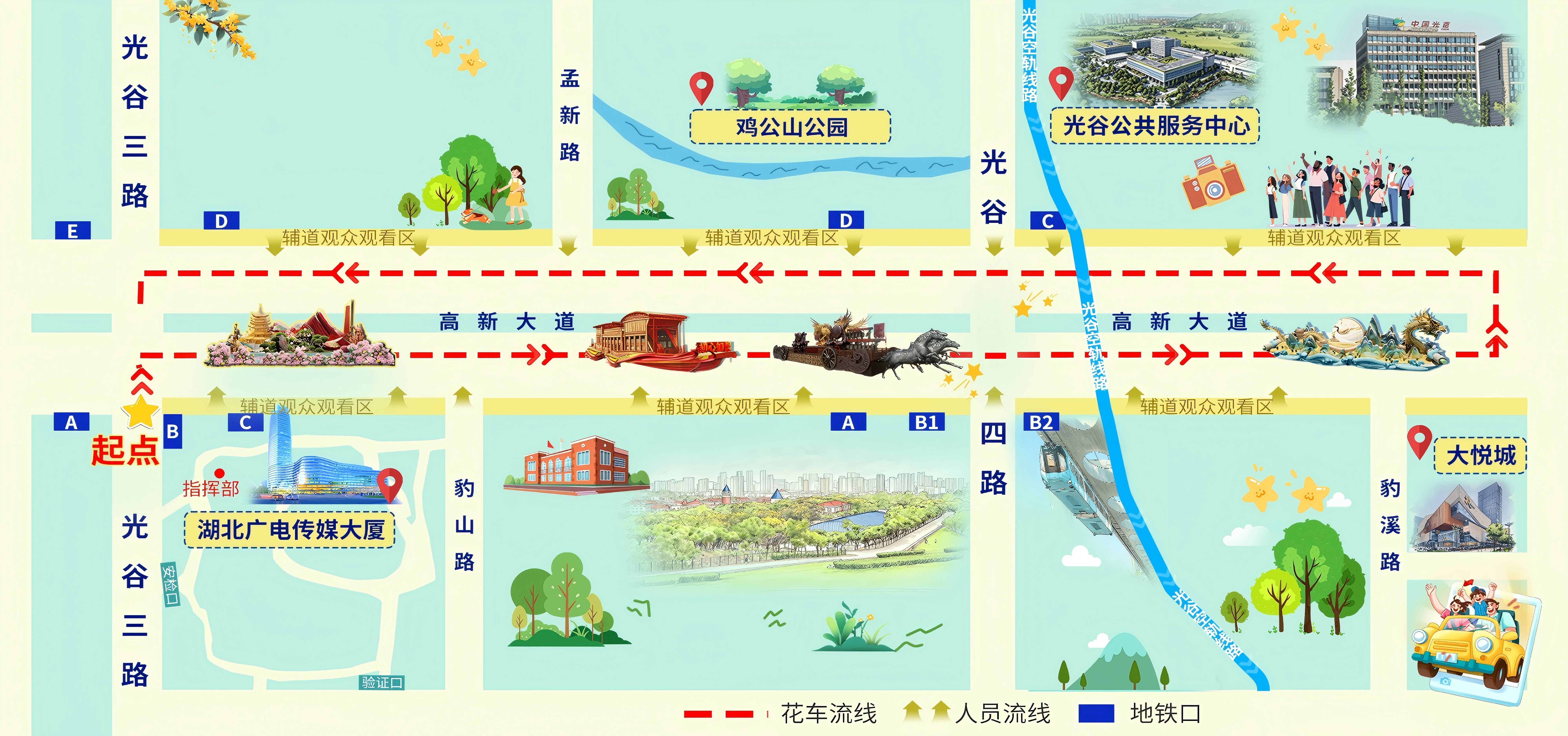 花车大巡游具体路线为:湖北广电传媒大厦——大悦城——东湖新技术开发区管委会——鸡公山公园——光谷文化中心(在建)。