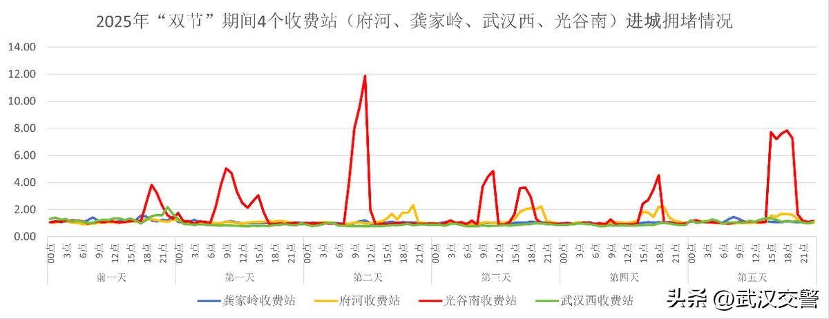 进城方向交通压力较大的为光谷南收费站,预计放假前一天的18时至21时、假期首日的8时至15时、假期后三天的11时至19时,车流量密集。