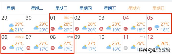 根据气象部门信息,双节期间我市整体以多云为主,其中10月5日可能有降雨,气温保持在17至28℃,天气较为凉爽,适合出行游玩。