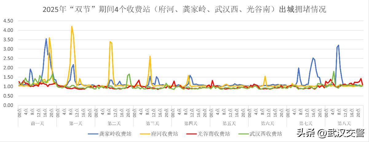 出城方向拥堵较为突出的为龚家岭、府河收费站,其中龚家岭收费站预计在放假前一天16时至19时车流量集中;府河收费站在假期首日8时至11时交通压力明显增大。