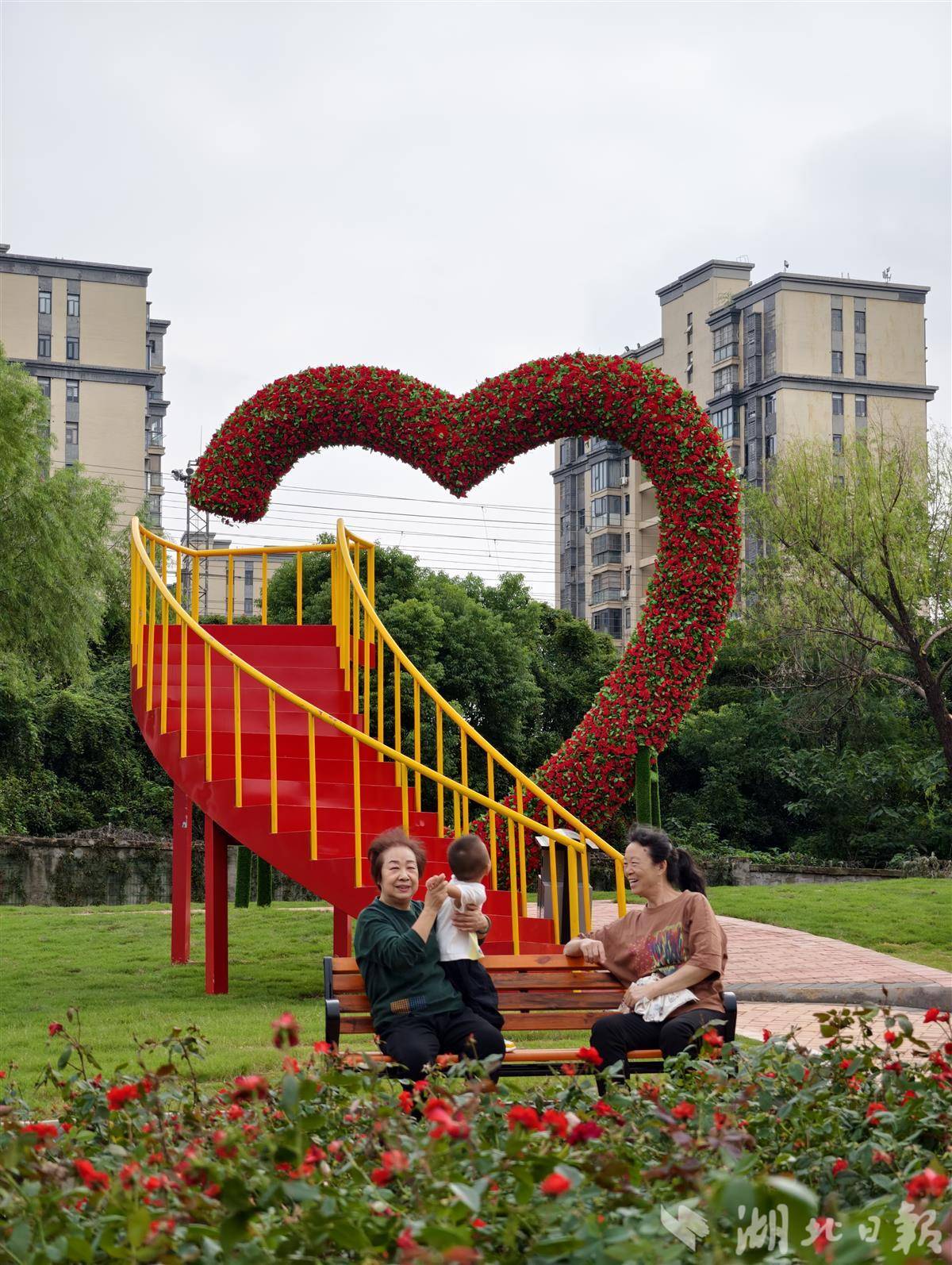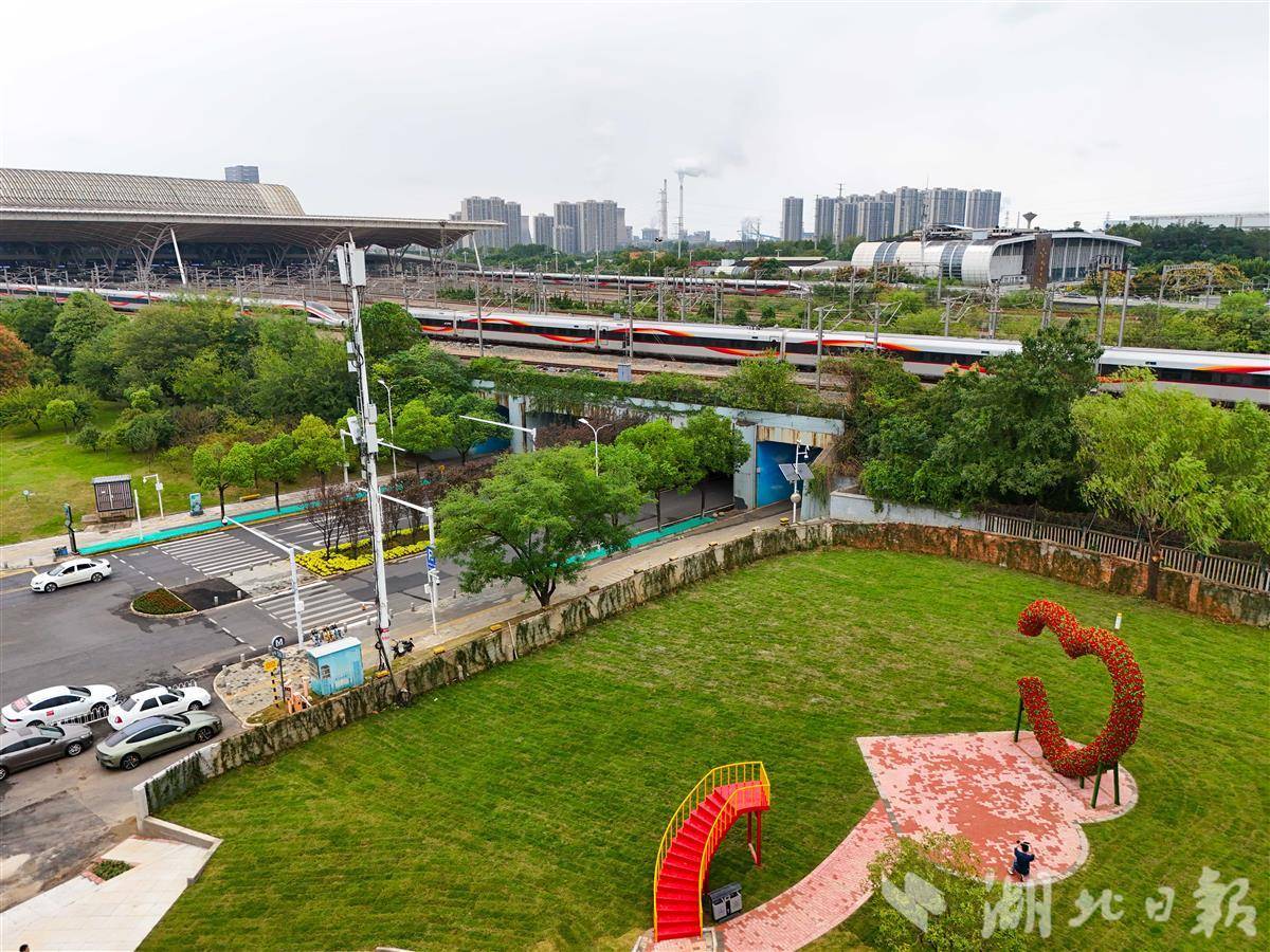 湖北日报讯(记者张竞恒、通讯员朱仙红、谢卓维、王越)“复兴号要开过来了,快摆好姿势!”9月29日一早,一座刚亮相不久的“口袋公园”迎来了不少市民和游客。当列车如一支银色“丘比特之箭”穿行而过,“射”进爱心花环中央,不少人举起手机,争相定格这浪漫一幕。