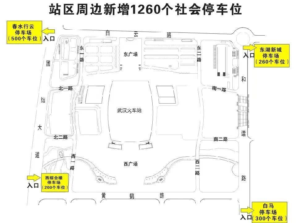 针对自驾旅客,武汉站在原有3个社会停车场(2464个车位)基础上,新增4个停车场共1260个车位,车位总量增长51%,分布于站区东南西北四角,收费标准清晰透明。