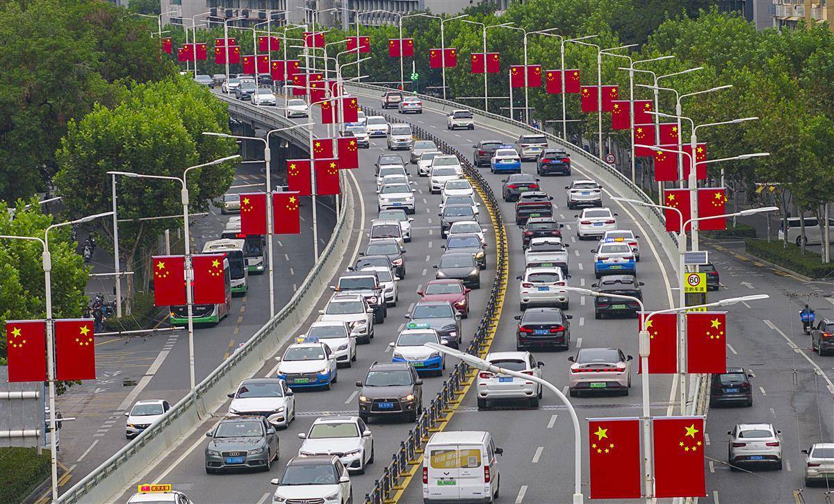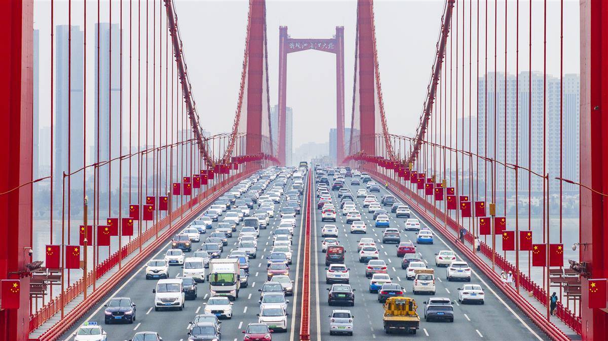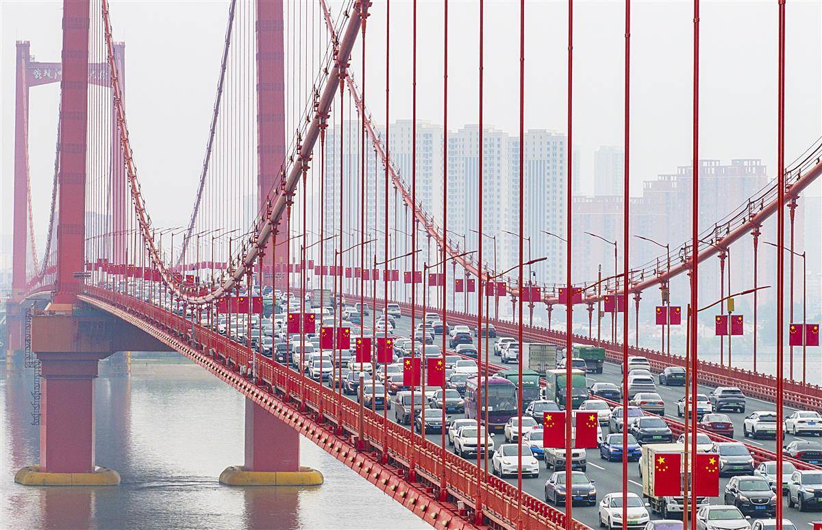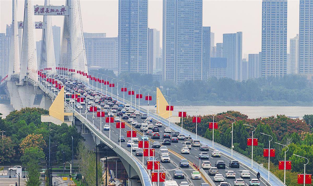 10月1日,武汉鹦鹉洲长江大桥,滚滚车流从挂满国旗的大桥上通过,与气氛浓烈的中国红交相辉映。国庆节长假,武汉长江大桥、长江二桥、杨泗港长江大桥以及许多高架桥等桥梁上都悬挂上了鲜艳夺目的五星红旗,放眼望去满目喜庆。“桥”见中国红,共抒爱国情,一面面五星红旗沐着阳光,鲜艳如火,井然有序 汇成对祖国深情的告白。(湖北日报全媒记者 朱熙勇 摄)