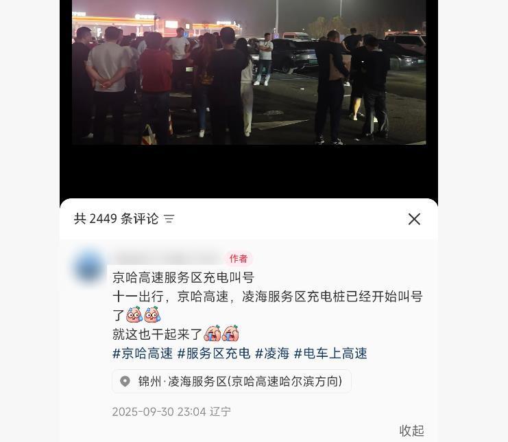 十一前夕,9月30日晚,多位车主称,京哈高速凌海服务区电车充电,已经开始“排队叫号”了。10月1日,一名电车车主告诉极目新闻记者,30日晚,凌海服务区有人拿着大喇叭在充电桩处喊号,自己排了半个多小时才充上了电。