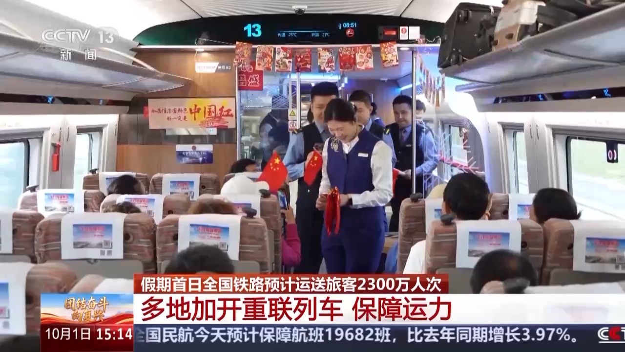 总台央视记者 陈晰:今年国庆、中秋相遇,旅游、探亲等多种出行需求叠加,全国铁路预计,今天将是假期里客流最旺的一天,运送旅客将达2300万人次,计划加开旅客列车2106列,为了让大家走得顺畅便捷。