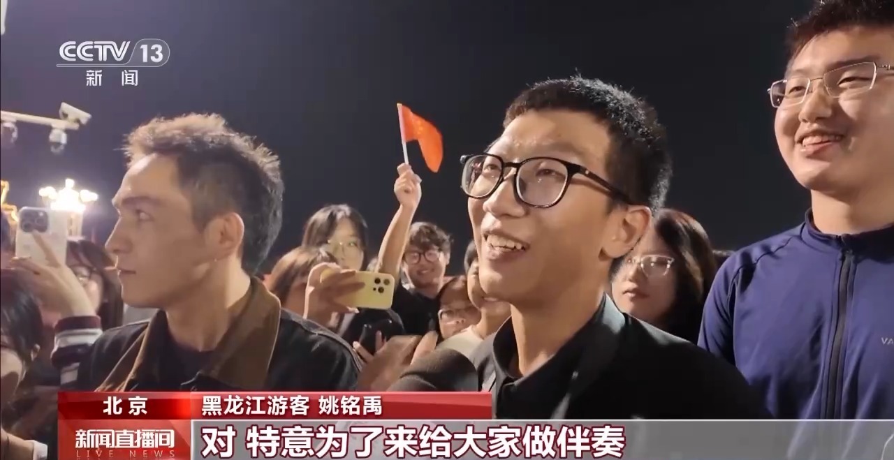 黑龙江游客 姚铭禹:昨天练到12点,特意为了来给大家做伴奏,希望和大家一起来演唱这首振奋人心的歌曲。