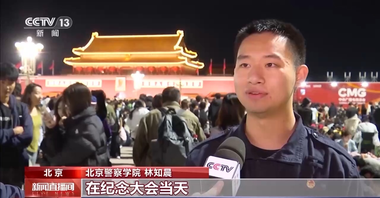 北京警察学院 林知晨:纪念大会当天,我承担了和平鸽放飞任务。我们的位置是空中方队的轴线,正好从我们头顶上飞过去,非常震撼。打心底里觉得咱们国家非常强大。