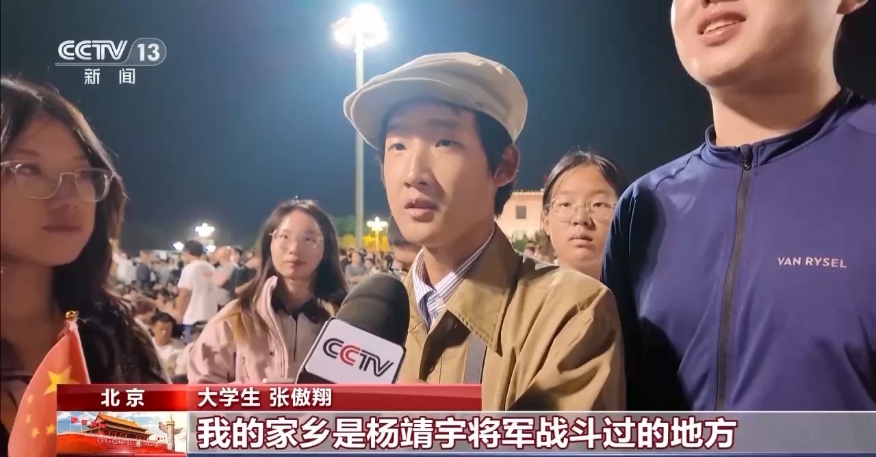 大学生 张傲翔:今天想来看升旗主要是因为,我的家乡是杨靖宇将军战斗过的地方,在9月3日的阅兵上,杨靖宇支队这面战旗真正飘扬在了天安门广场上,我的内心无比自豪。我今天就要来看看,我们抗联的战士同志们用生命换来的这面五星红旗,到底是怎么样在北京、在祖国的心脏、在天安门广场上升起来,怎么样在朝霞当中飘扬的。