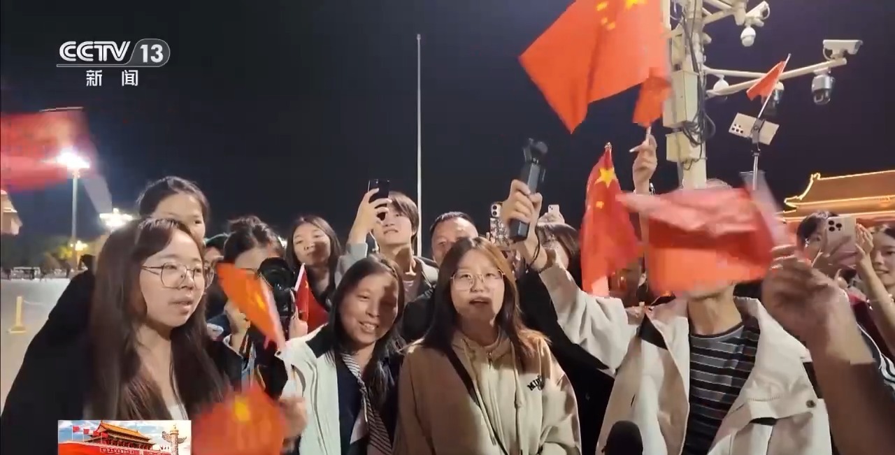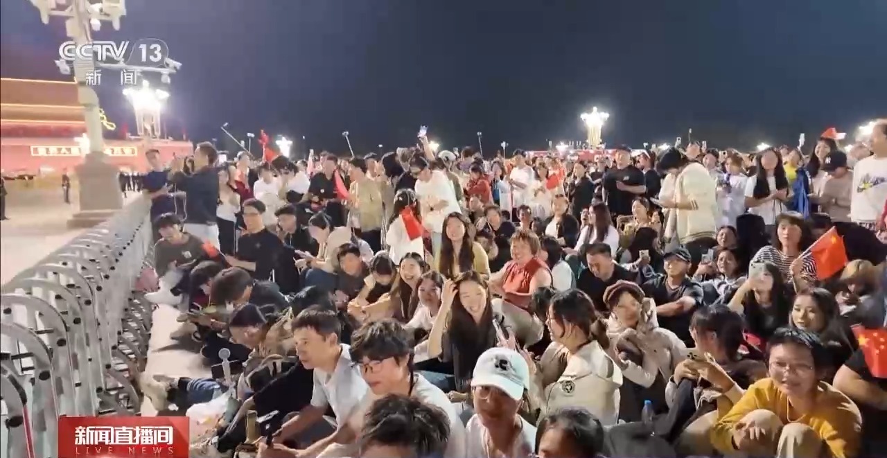 刚过晚上10点,天安门广场上已人头攒动,视野好的位置早已挤满了人。夜色渐浓,人声却更加鼎沸起来,大家齐声唱起了歌,“歌唱我们亲爱的祖国,从此走向繁荣富强……”