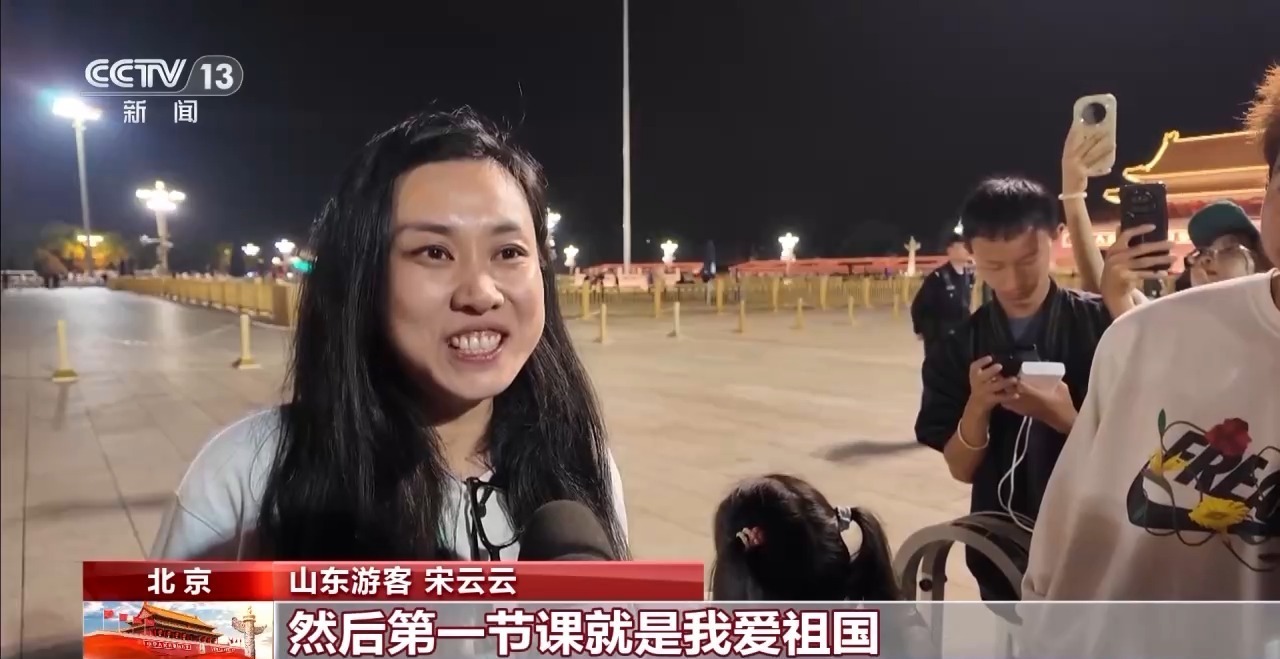 山东游客 宋云云:我们两个下了高铁就跑,下了地铁又开始跑,一路奔跑过来的。孩子刚上一年级,第一节课就是我爱祖国,我爱北京天安门,我爱五星红旗,所以她说一定要来看升国旗。