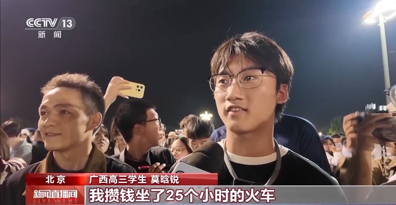 广西高三学生 莫晗锐:我攒钱坐了25个小时的火车,从广西来到了我们的首都北京,自己一个人来观看升旗仪式,非常激动。我下个月成年,希望能在成年之前来到北京观看一次升旗仪式,像是我的成人礼一样。