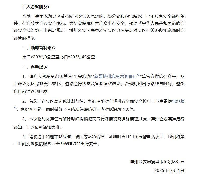 1日21时45分,平安赛湖发布交通管制通告称,因赛里木湖景区受持续风吹雪天气影响,部分路段积雪结冰,已不具备安全通行条件,存在较大交通安全隐患。博州公安局赛里木湖景区分局决定对景区南门x203线0公里至北门x203线45公里实施临时交通管制措施。