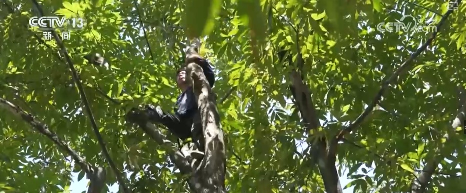 在临安区湍源村这片180多亩的山核桃林,3000多棵山核桃树迎来2025年的黄金采收季。林农们横跨在树杈间,用手中的长杆一扬、一绕,“噼里啪啦”的落果声便在林间响起。