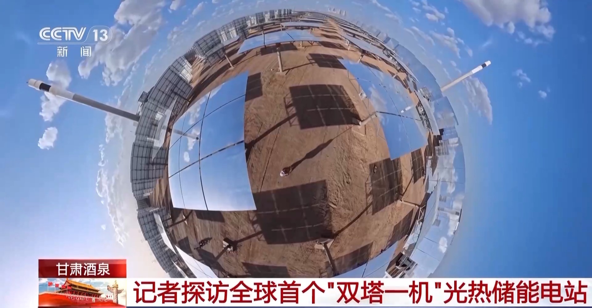 总台央视记者 张丛婧:这里是全球首个“双塔一机”光热储能电站,我现在就站在吸热塔的顶端,此时距离地面超过200米。从这里俯瞰,整座电站由两个巨大的圆形镜阵组成,每个阵列中心都矗立着一座吸热塔,吸收镜面反射的阳光。