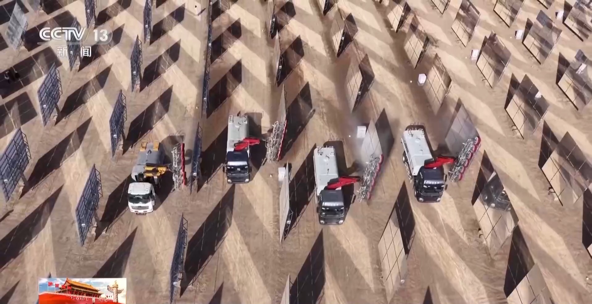 三峡能源瓜州光热储能项目经理 杨旭亮:戈壁滩上风沙大,我们会定期给定日镜“洗洗脸”,定日镜采用超白玻璃特种材料制成,反射效率高达94%,能够将更多阳光高效反射至吸热塔,显著提升发电效率。