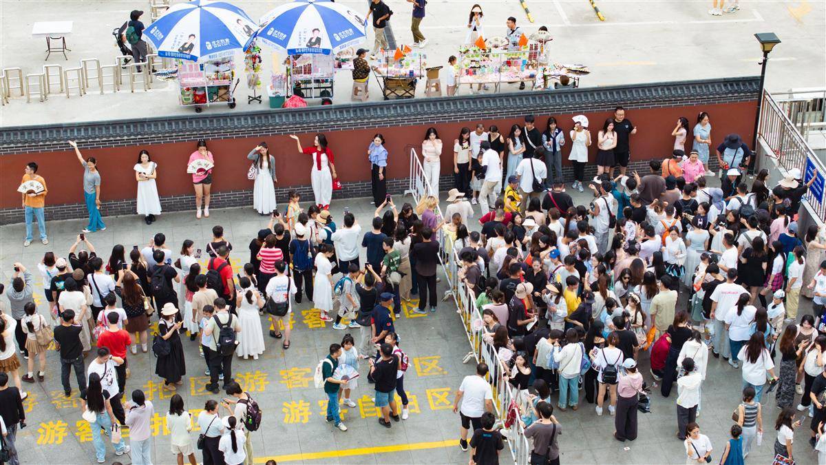 2025年10月2日,“十一”小长假第二日 ,武汉地铁5号线司门口黄鹤楼站C出口旁的红墙吸引众多外地游客前来拍照打卡,为杜绝部分商业旅拍摄影师长期占位影响游客体验感,红墙前方新设置了专门的游客自拍区域,游客可自由免费打卡拍照。该红墙自2023年设立以来,地铁司门口黄鹤楼站客流屡破新高,其中大多数都是外地游客前来和黄鹤楼合影打卡,在红墙与黄鹤楼同框成为不少外地游客来汉的必定行程之一。(湖北日报全媒记者 何宇欣 摄)