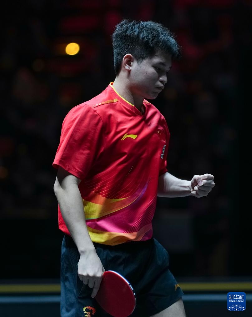 10月2日,林诗栋在比赛中庆祝得分。