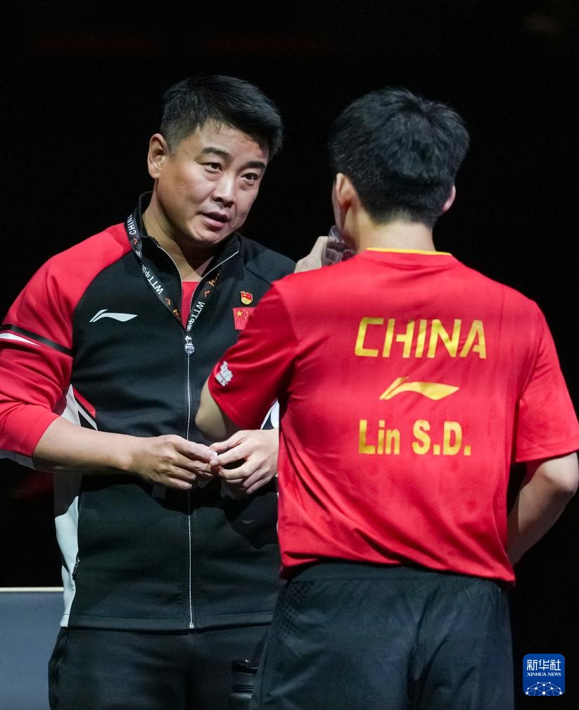 10月2日,林诗栋(右)在比赛间隙接受教练王皓的指导。