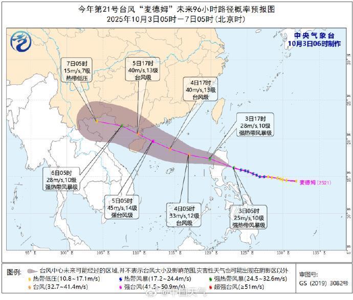 中央气象台10月3日6时继续发布台风预报,今年第21号台风“麦德姆”10月3日早晨由热带风暴级加强为强热带风暴级,早晨5点钟其中心位于菲律宾马尼拉东北方约290公里的近海海面上,中心附近最大风力有10级(25米/秒),七级风圈半径100-200公里。预计“麦德姆”3日下午至夜间将移入南海东部海面,之后逐渐向广东西部到海南岛东部一带沿海靠近,强度逐渐增强,最强可达强台风级(14-15级,42~48米/秒)。