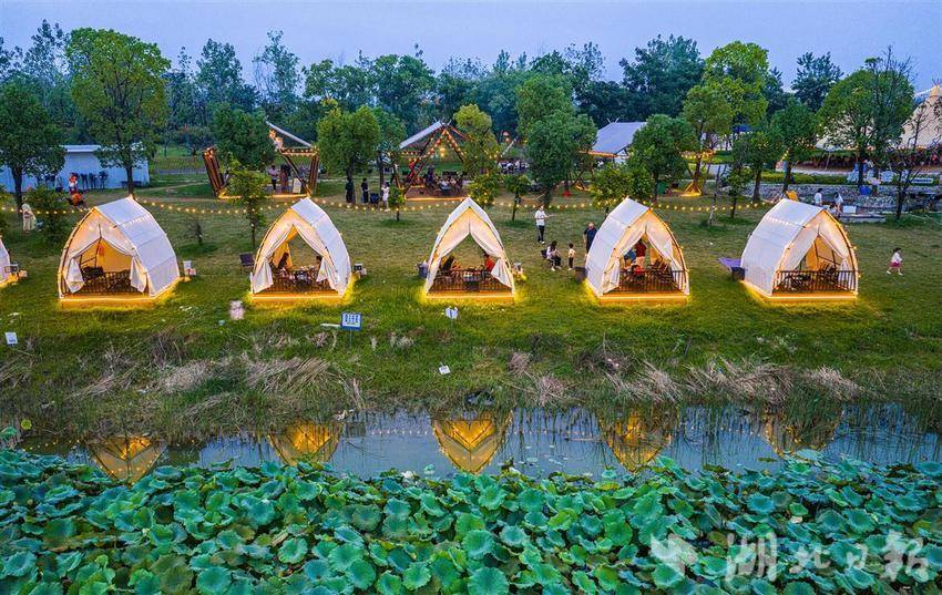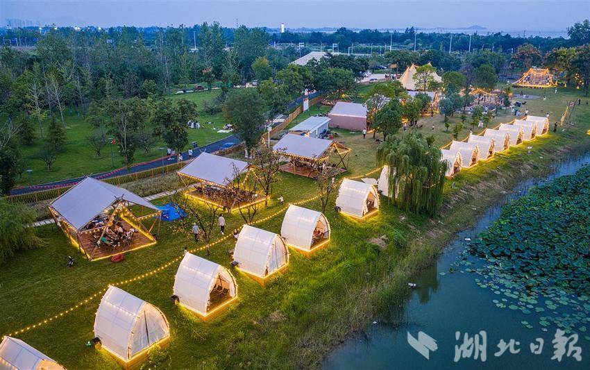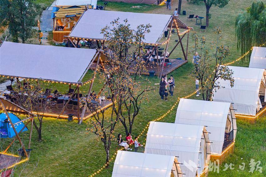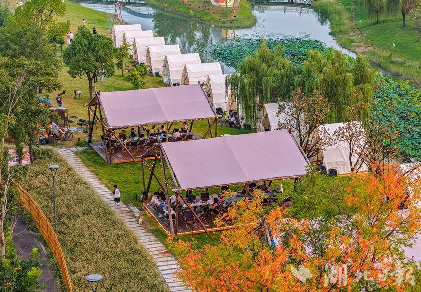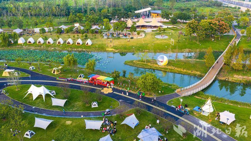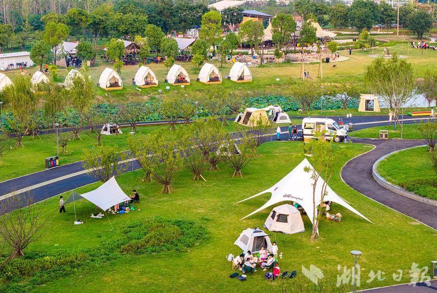 10月3日,黄石市经开区奥体公园,游客正在露营休闲乐享假期。近年来,黄石充分发挥生态环境、公园、湿地公园优势,积极探索露营经济,并与民宿推广、文化、体育、音乐等产业相互融合,推动文旅产业综合发展。(通讯员 周巍 摄)