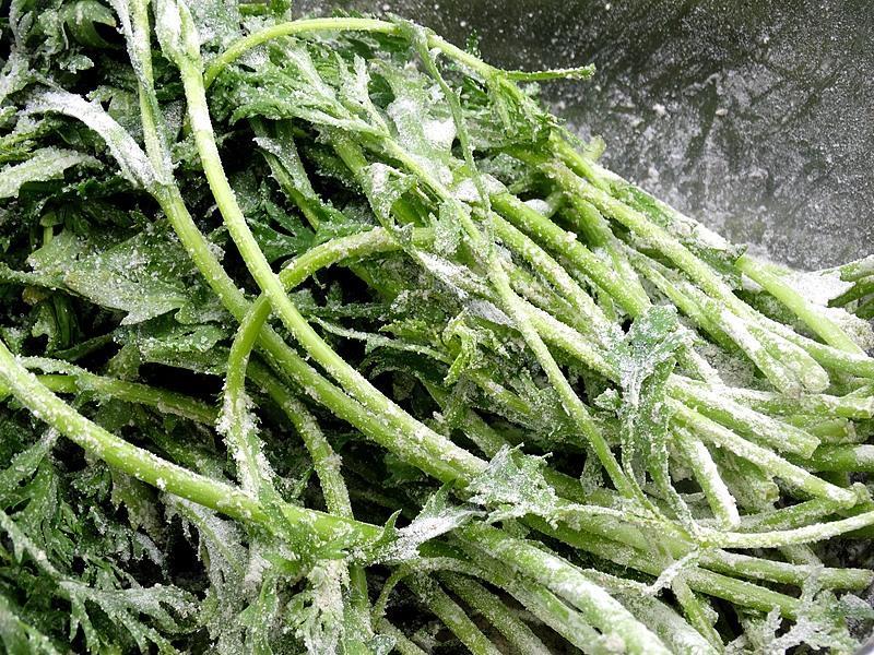 有些大厨会建议在菜叶上淋上一点油再裹面粉,这样菜叶间不容易粘连。但其实我们只要按照上述方式处理好菜叶,再注意裹粉的技巧,也能避免粘连成坨。