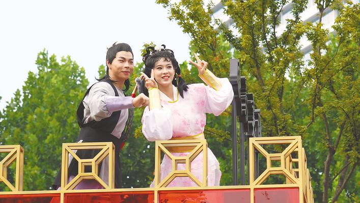 10月1日,“郭靖”和“黄蓉”在花车上向观众打招呼。(湖北日报全媒记者 张竞恒 摄)