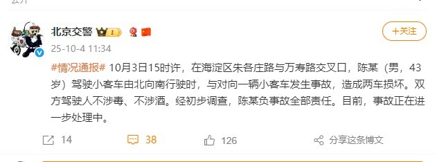 10月4日11:34,@北京交警发布情况通报:10月3日15时许,在海淀区朱各庄路与万寿路交叉口,陈某(男,43岁)驾驶小客车由北向南行驶时,与对向一辆小客车发生事故,造成两车损坏。双方驾驶人不涉毒、不涉酒。经初步调查,陈某负事故全部责任。目前,事故正在进一步处理中。