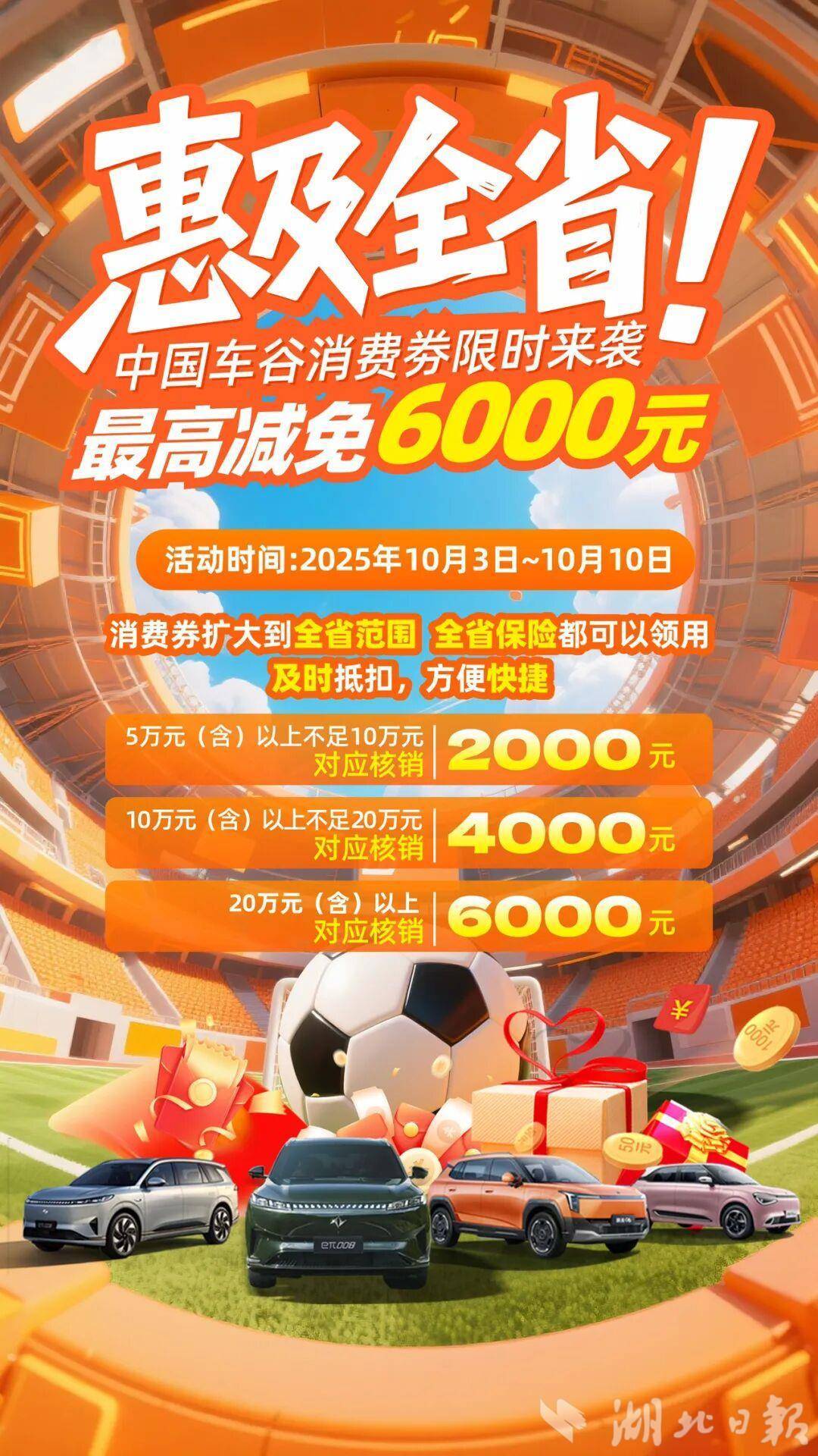 湖北日报讯(记者汪洋、通讯员蒋秋雨、杨玉立)从武汉经开区获悉,即日起至10月10日,中国车谷品牌运营中心推出汽车消费黄金周全省让利活动,消费者购买“车谷造”相关品牌车型,最高可减免6000元。