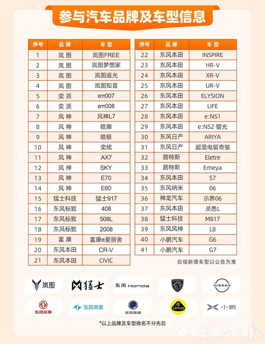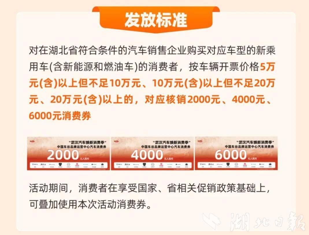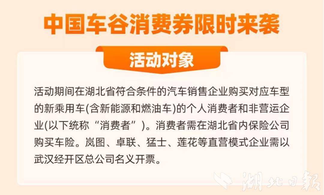 优惠对象:活动期间,在湖北省符合条件的汽车销售企业购买对应车型新乘用车(含新能源和燃油车)的个人消费者和非营运企业,需在湖北省内保险公司购买车险。岚图、卓联、猛士、莲花等直营模式企业,需以武汉经开区总公司名义开票。