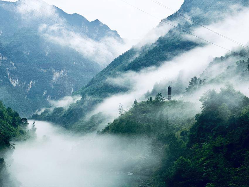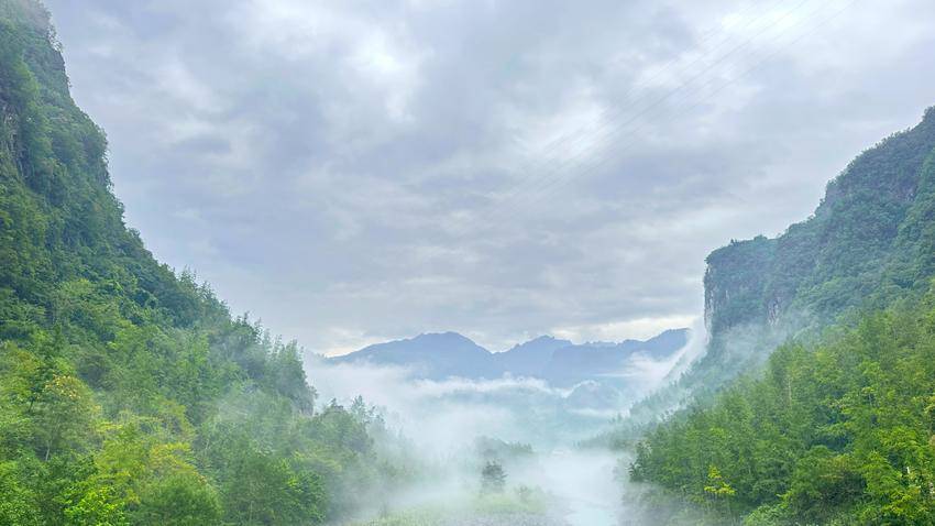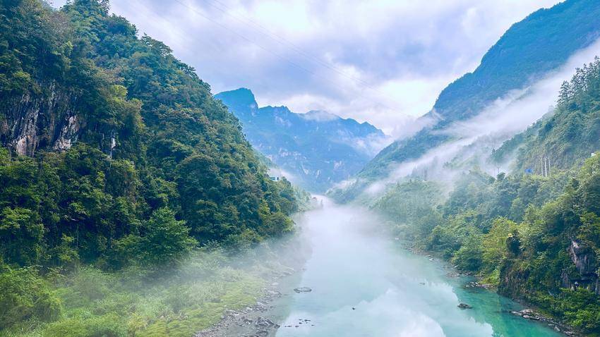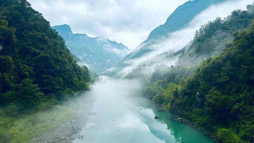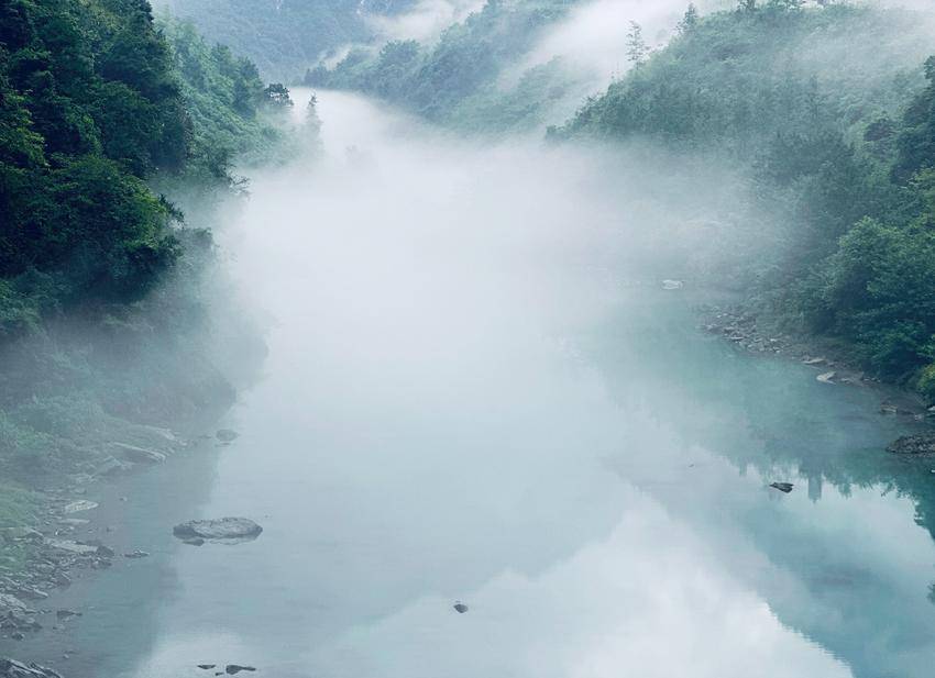 连绵的青山被茂密的植被覆盖,宛如绿色屏障。清澈的河道在群山间蜿蜒,雾气如轻纱般弥漫在水面与山间,时而聚拢,时而散开,将山水晕染得若隐若现。远山在云雾中时露真容,与近旁的葱郁山林、澄澈河道相映成趣,仿佛一幅水墨丹青在眼前徐徐展开。