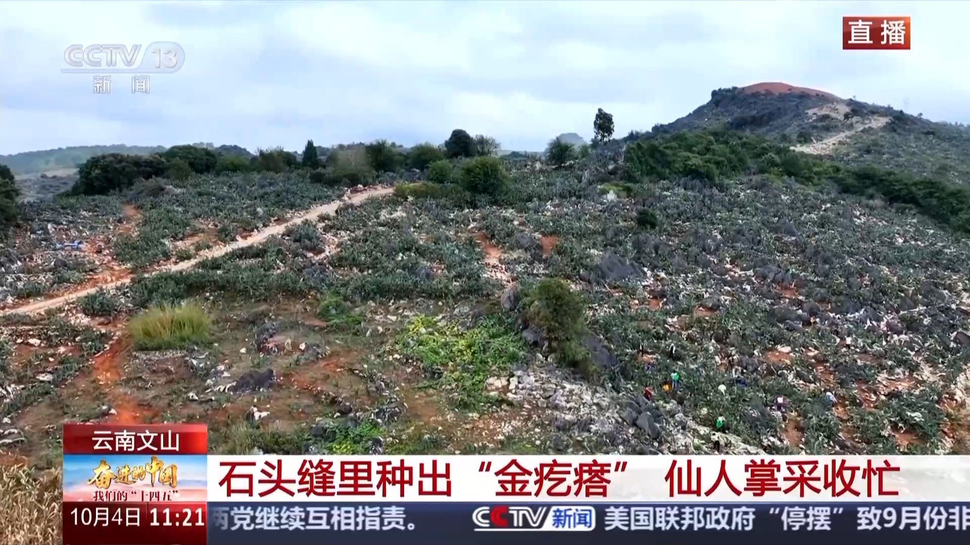 总台记者 李腾飞:来到文山壮族苗族自治州庄子田村的仙人掌种植基地,这里漫山遍野种满了仙人掌,绵延铺展开来。