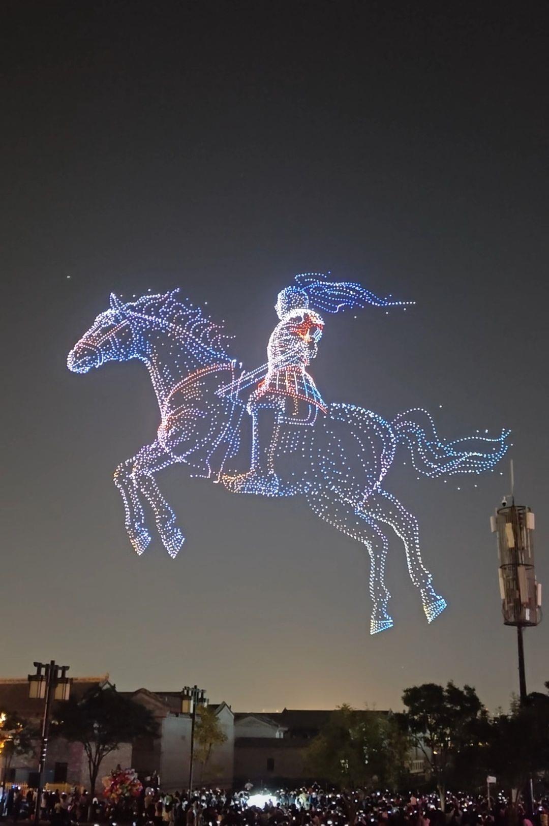 当晚8时30分,无人机矩阵在夜空中展开梦幻演绎。从五星红旗到东风5C,多元国庆元素的变化瞬间点燃现场热烈氛围;从云冈石窟到低空热气球,大同特色元素轮番呈现,实现古今穿越的视觉碰撞。云冈石窟的庄严佛像以立体形态悬浮,衣袂飘动的细节非常灵动;马背上的花木兰持剑而立,飒爽英姿掠过夜空;配合国庆节主题,鲜艳的五星红旗在天幕上展开,“祝福伟大祖国繁荣昌盛国泰民安”的光影字幕与国旗交相辉映,现场瞬间响起热烈掌声。