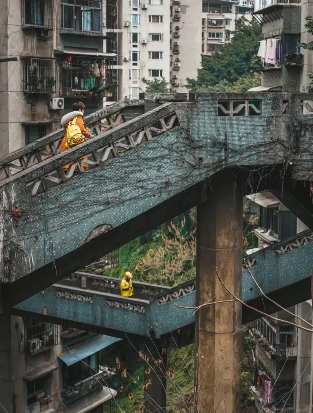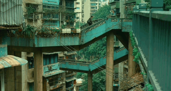 影片中令人印象深刻的一场追逐戏,取景地就在重庆渝中区观音岩临华路,这里的两座空中廊桥纵横交错,将道路与楼宇紧密相连,形成极具张力的空间层次,带来强烈的视觉冲击。